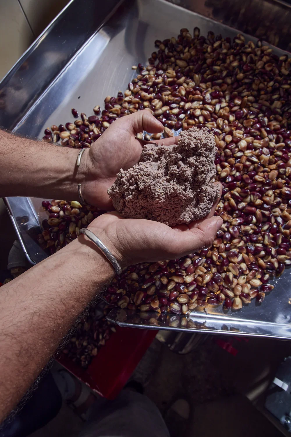 Person holding a large chunk of purple and brown popcorn kernel mixture over a tray of popcorn kernels.